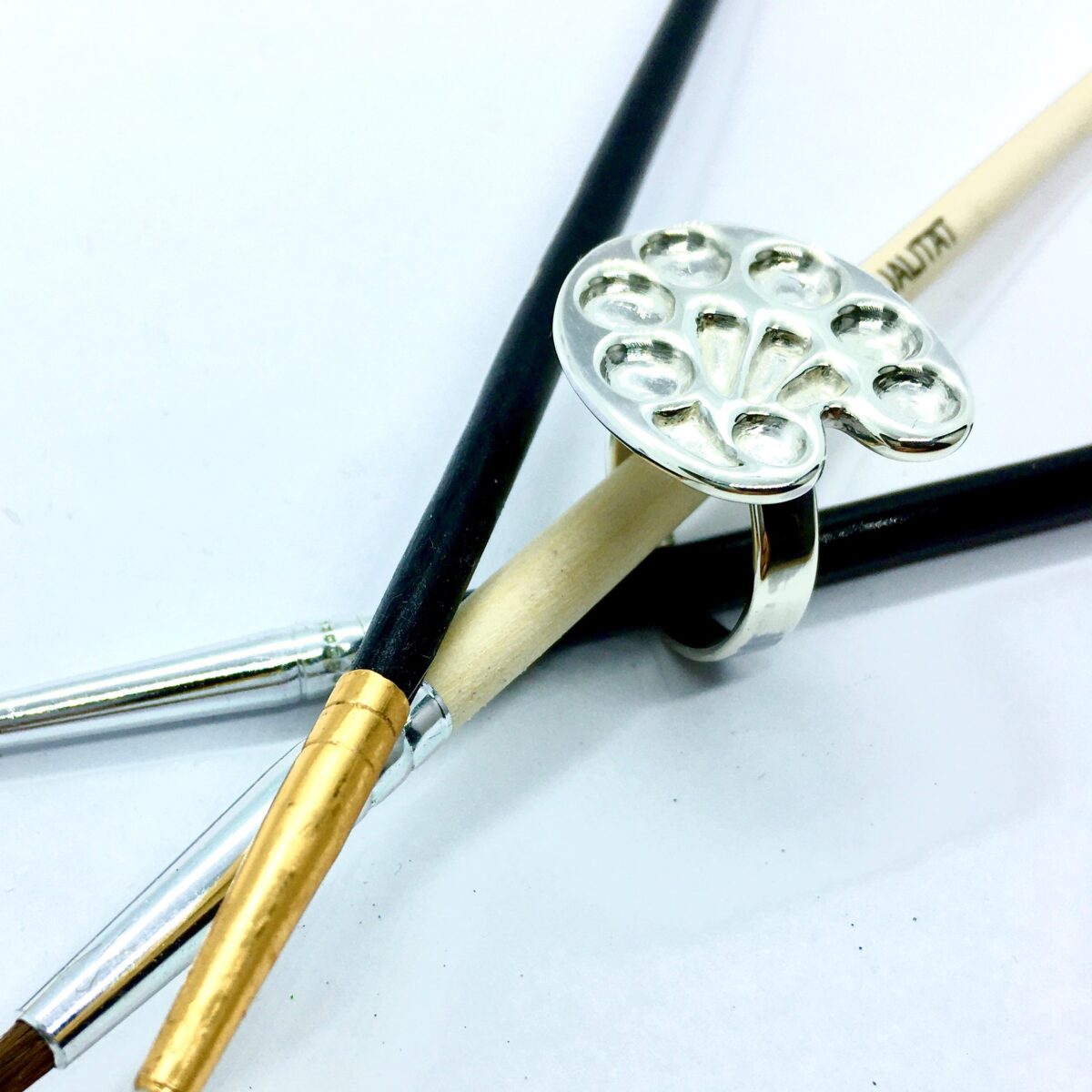 Anillo paleta, anillo con forma de paleta de pintor, realizado artesanalmente en plata de ley con baño de rodio, con hendiduras para colocar la pintura. Talla regulable