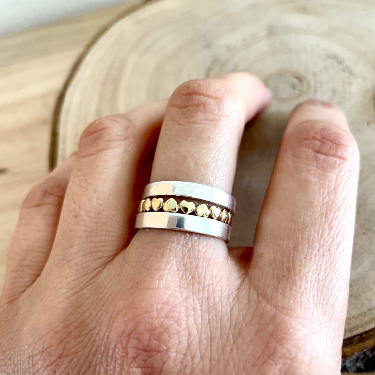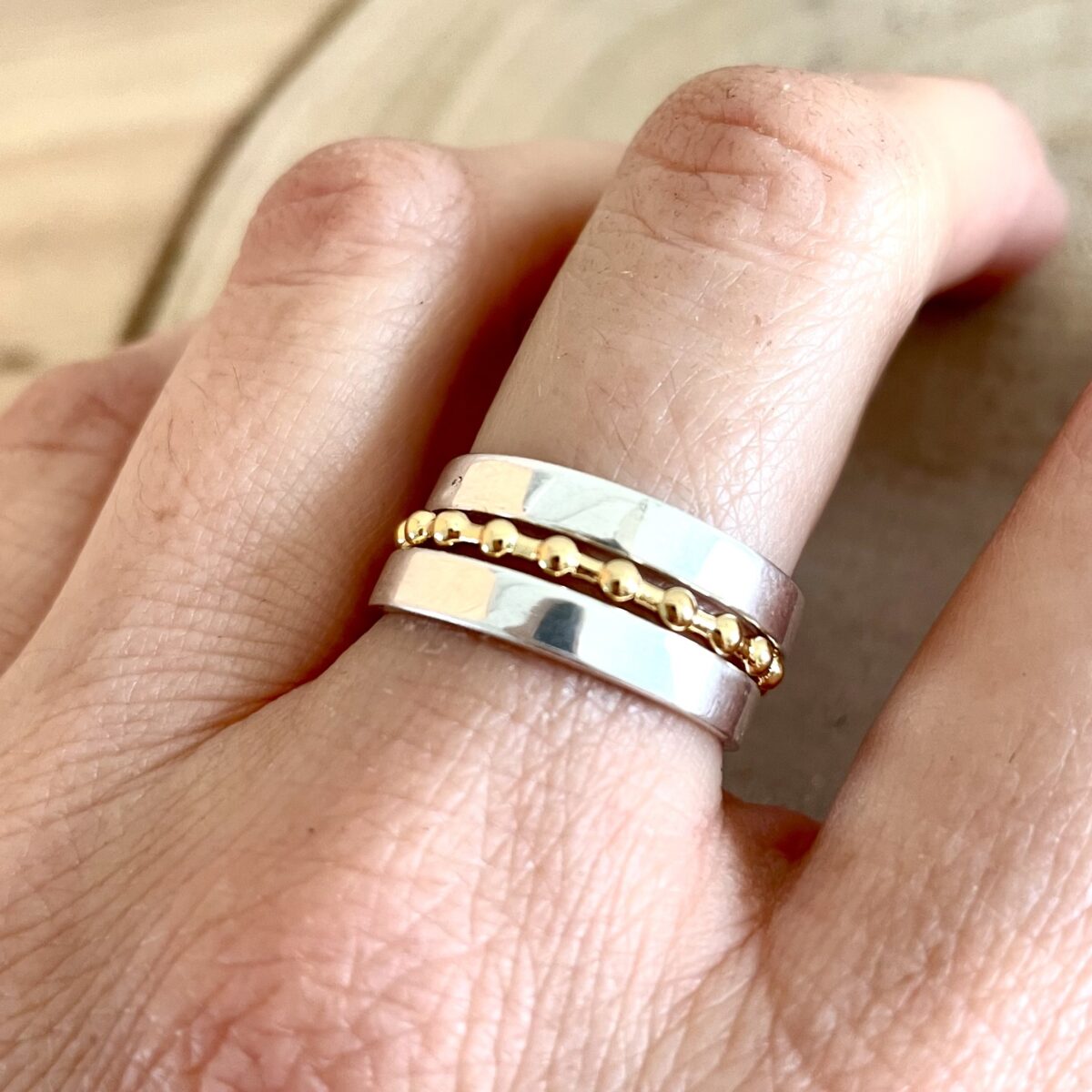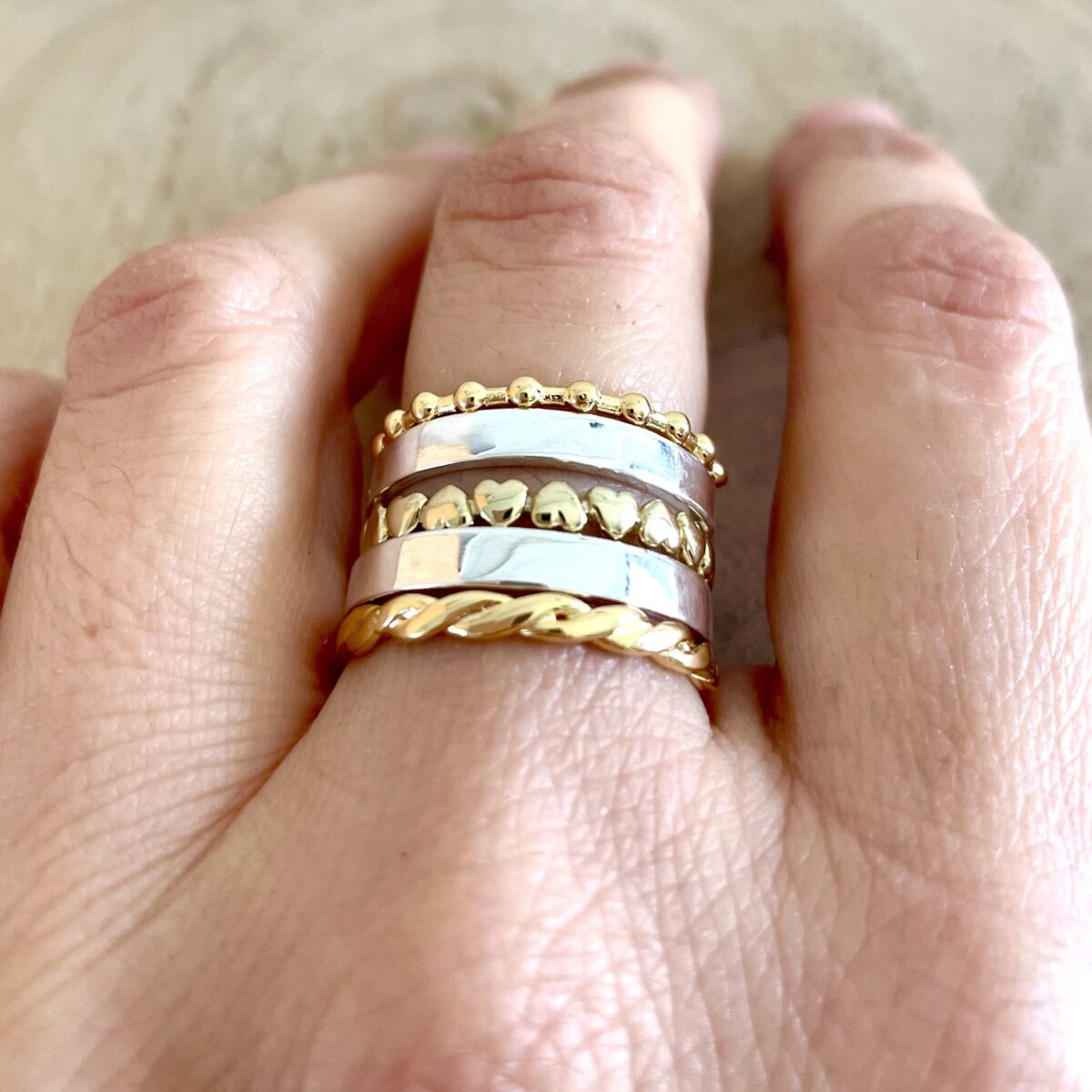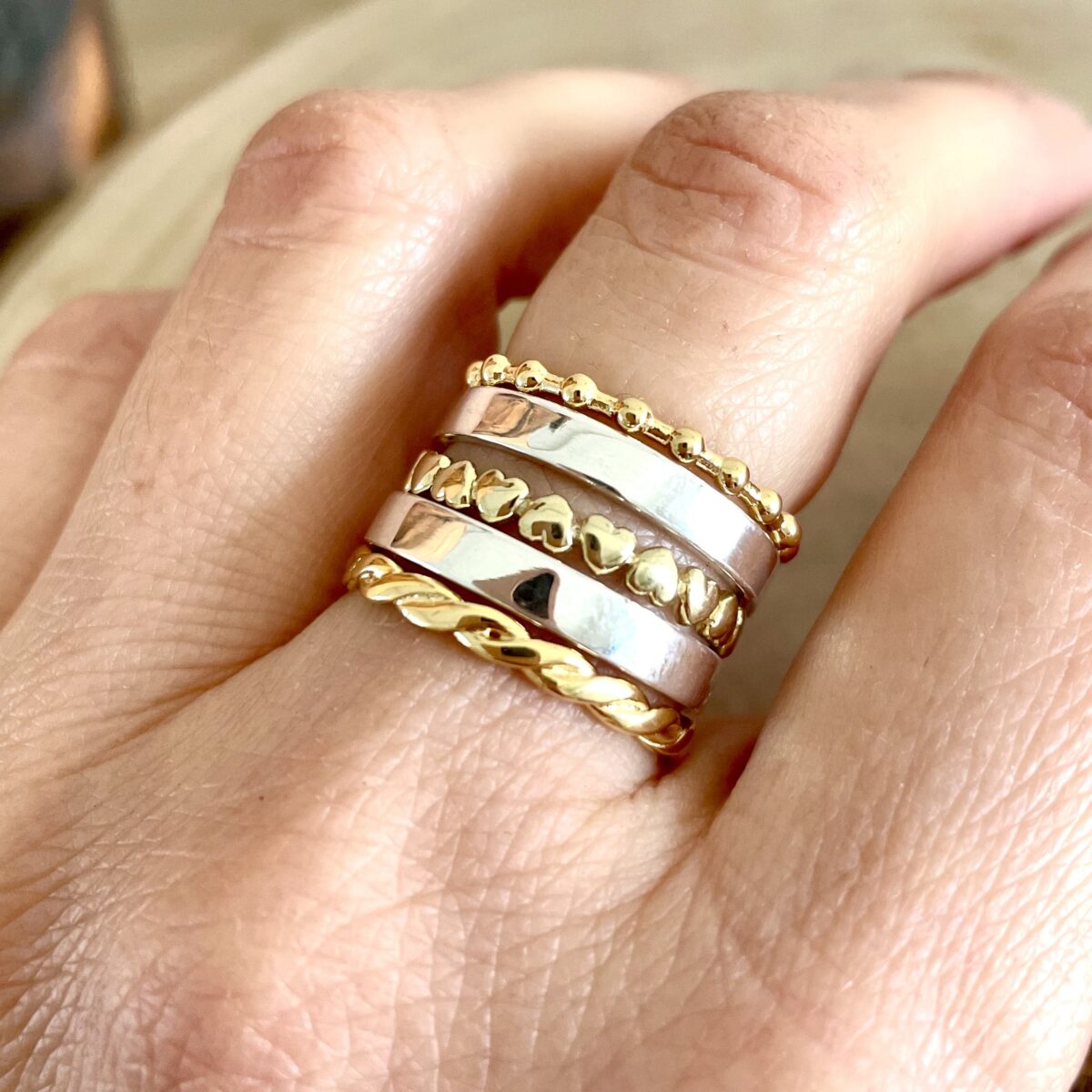 ANILLOS QUINTETO, SEPARADOS, COMBINABLES, MÚLTIPLES OPCIONES, UNA O DOS ALIANZAS EN PLATA DE LEY PLANA, PARA GRABAR LOS NOMBRES QUE QUIERAS O NO, Y 5 ANILLOS FINOS CON DIFERENTES TEXTURAS EN PLATA DE LEY CHAPADA EN ORO 18K, PARA COMBINAR UNO O DOS CON LAS ALIANZAS. SE PUEDEN COMPRAR POR SEPARADO.
