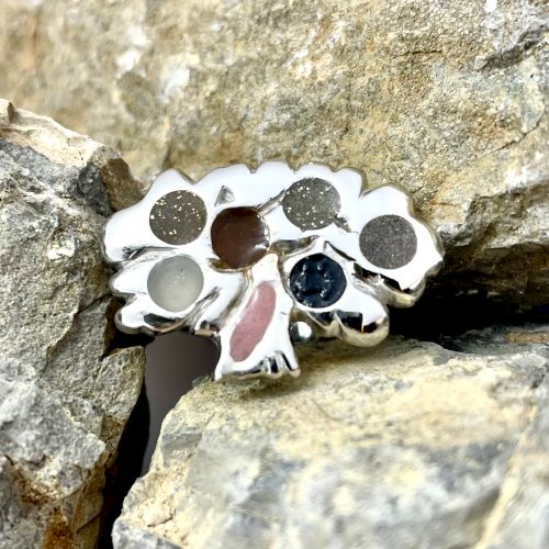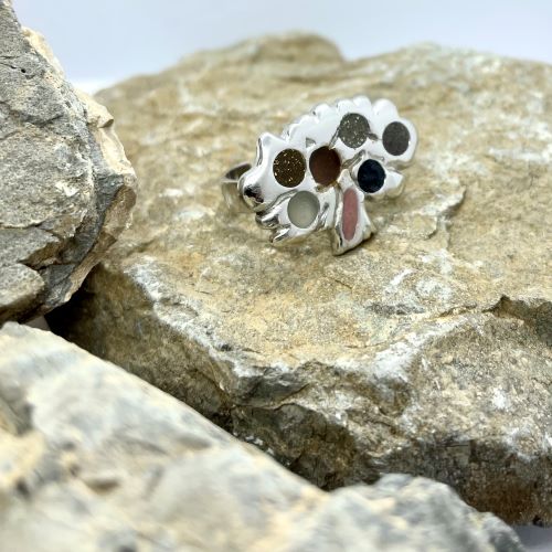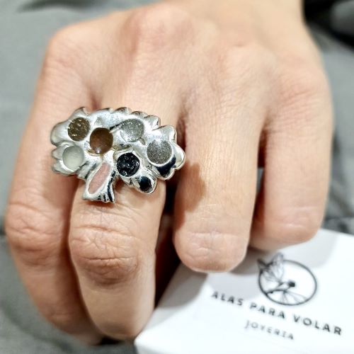 ANILLO QUE REPRESENTA UN OLIVO, ARBOL CARACTERÍSTICO DE LA FAMILIA DE LA DUEÑA, EN CADA CÍRCULO RESTOS DE PIEDRAS QUE LA PAREJA HA IDO RECOPILANDO EN SUS VIAJES POR TODO EL MUNDO, Y EN EL TRONCO, PIEDRA DE LA PLAYA CERCANA QUE HA VISTO CRECER SU AMOR. UNA DE LAS PIEZAS MÁS COMPLEJAS Y SIGNIFICATIVAS EN CUANTO A SU SIMBOLISMO. REALIZADA EN PLATA DE LEY BAÑADA EN RODIO.