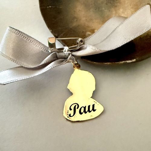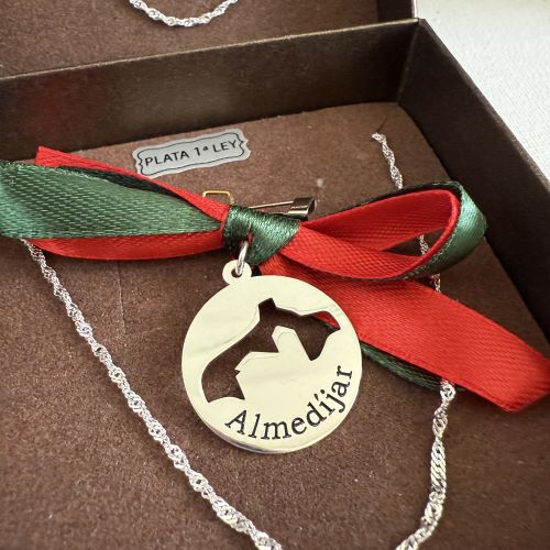 BROCHE DE TU PUEBLO GRABADO O CALADO, PERSONALIZADO CON NOMBRE Y CON CINTAS DE COLOR DE LA BANDERA, HECHO A MANO EN PLATA DE LEY.