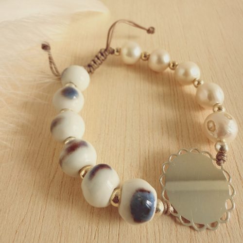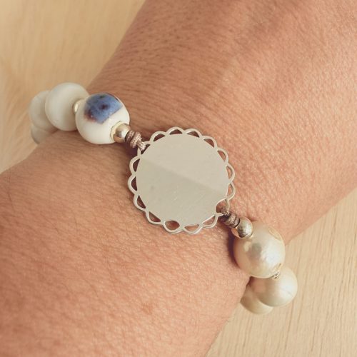 Esta original pulsera en plata de ley combina el metal con cuentas de cerámica y perlas cultivadas en agua dulce. Perfecta para grabar nombres, fechas o frases cortas. Realizada artesanalmente en nuestro taller.