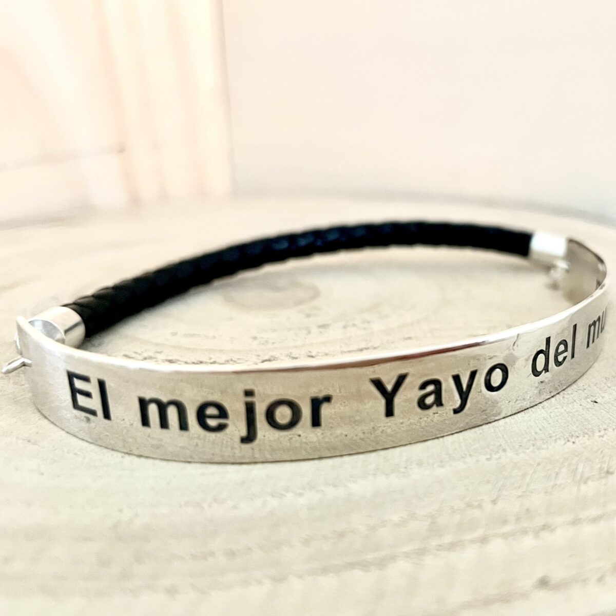 Esta pulsera única destaca por su diseño elegante y significativo, grabada con nombre, dedicatoria o coordenadas geográficas que representan un lugar especial. El cuero trenzado negro aporta comodidad y estilo, convirtiéndola en el regalo perfecto para quienes desean llevar consigo un recuerdo tangible de un momento o lugar inolvidable.